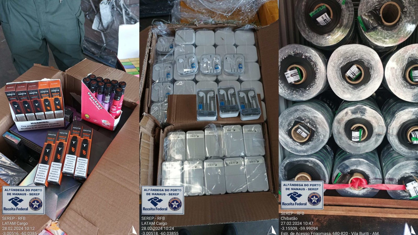 Foram identificadas variadas mercadorias estrangeiras sem comprovação de regular importação. Além disso, todas as mercadorias estavam desacompanhadas de documentação fiscal idônea. Cigarros eletrônicos, produto de importação e comercialização proibida no Brasil, estão entre as mercadorias retidas.