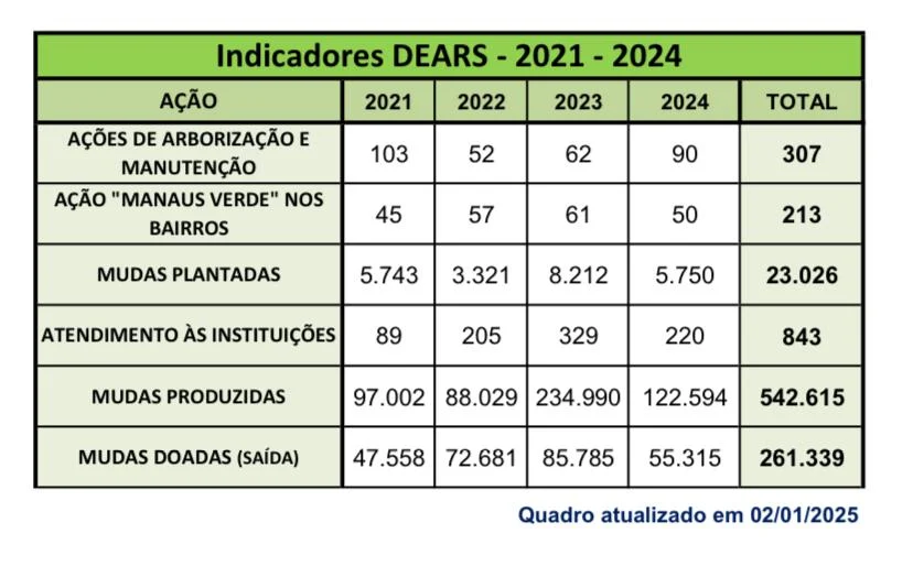 Entre 2021 e 2024, a gestão de David Almeida plantou 23.026 mudas e doou 261.339 à população em 213 ações itinerantes. Com a nova meta, o número de árvores a serem plantadas em 2025 representa quase dois terços do total realizado em quatro anos.