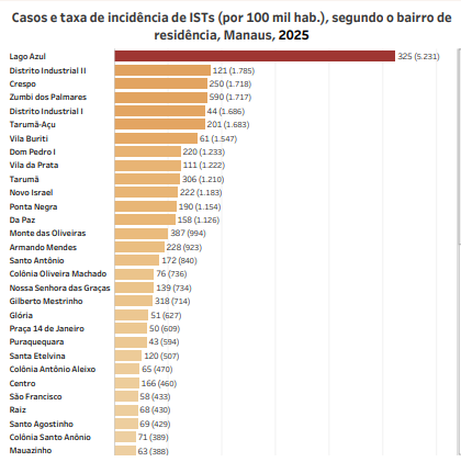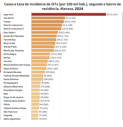 De acordo com dados da Fundação de Vigilância em Saúde do Amazonas (FVS), a cidade registrou 7.503 casos de ISTs em 2025. Entre os bairros mais afetados estão: