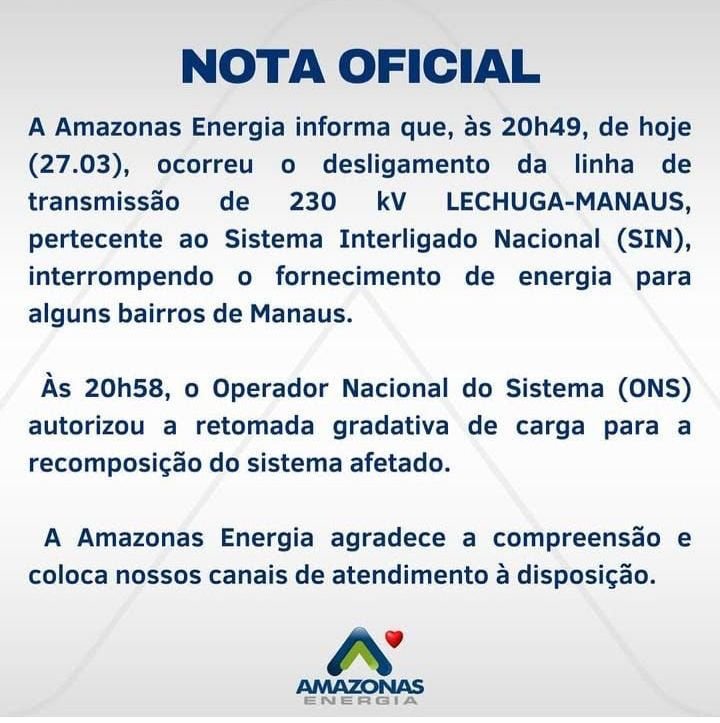 De acordo com nota da Amazonas Energia, o problema começou por volta das 20h, interrompendo o fornecimento de energia em diversas áreas da cidade. O Operador Nacional do Sistema (ONS) autorizou a retomada gradativa da carga às 20h58, permitindo a recomposição do sistema.