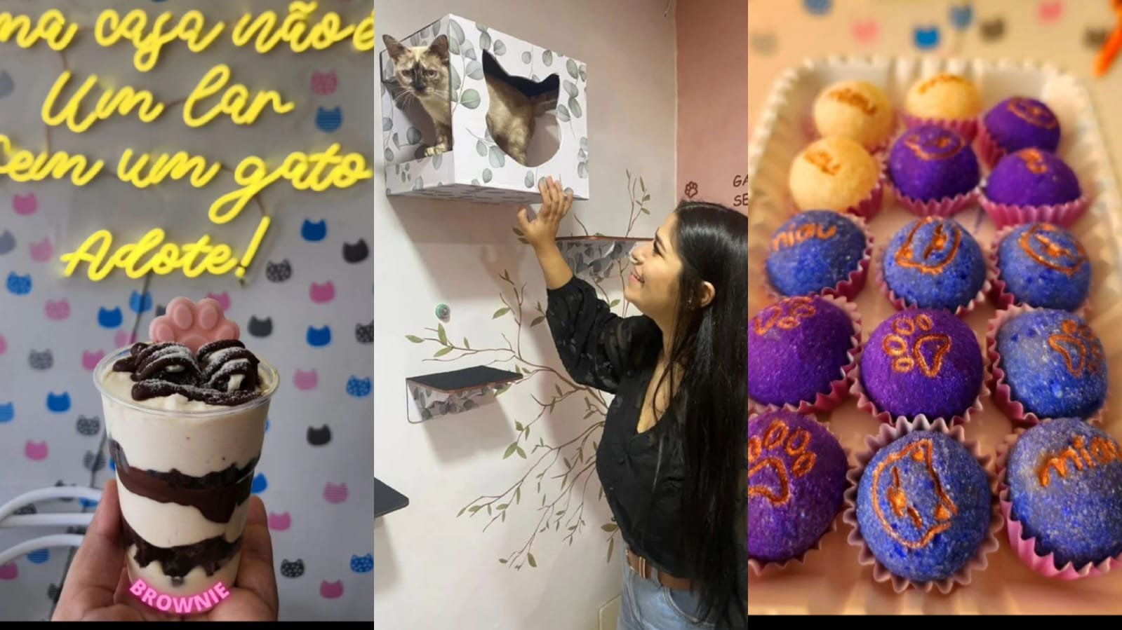 “A cafeteria é o carro-chefe da loja, porque nós temos comidas temáticas de gato. Temos biscoitinhos de leite, bolo em forma de patinha de gato e outros detalhes que são todos inspirados nos gatinhos”, explica Paula.