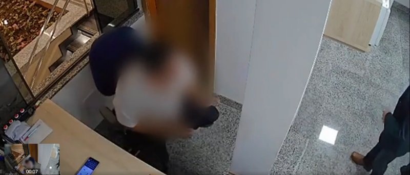 O crime foi registrado por câmeras de vigilância, as quais mostram a vítima se escondendo em um banheiro, enquanto o agressor desfere golpes de faca na porta.