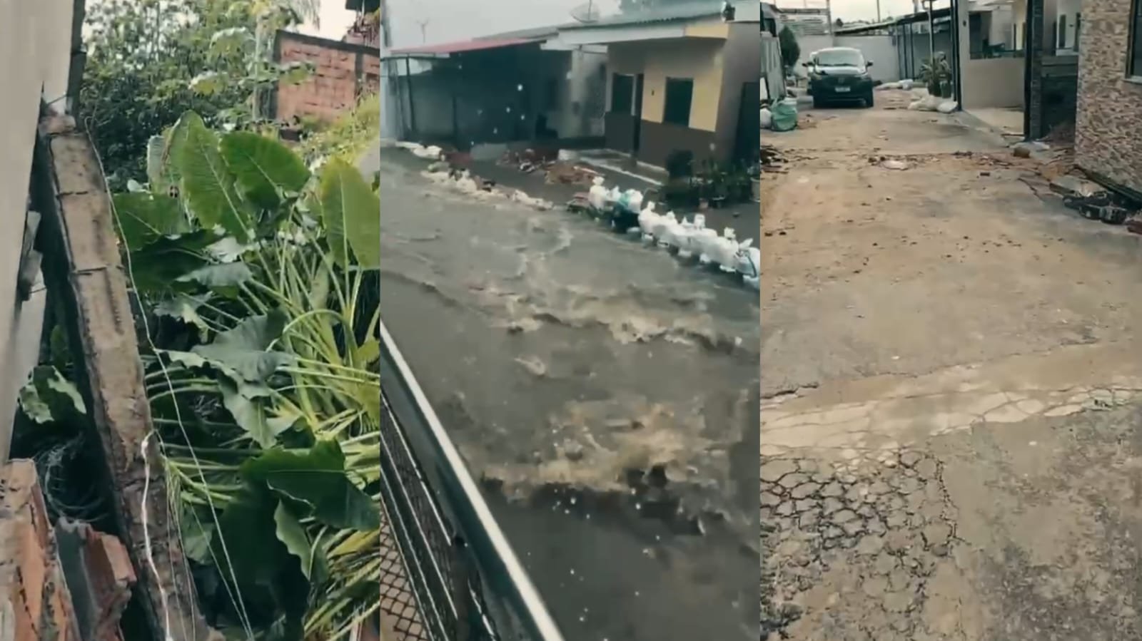 Fotos e vídeos enviados ao Portal RIOS DE NOTÍCIAS mostram a área tomada por água e enxurradas, ameaçando veículos e casas. Em um dos registros, é possível ver buracos no asfalto e uma grande cratera próxima a uma residência, que coloca em risco a estrutura do imóvel.