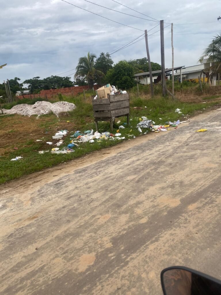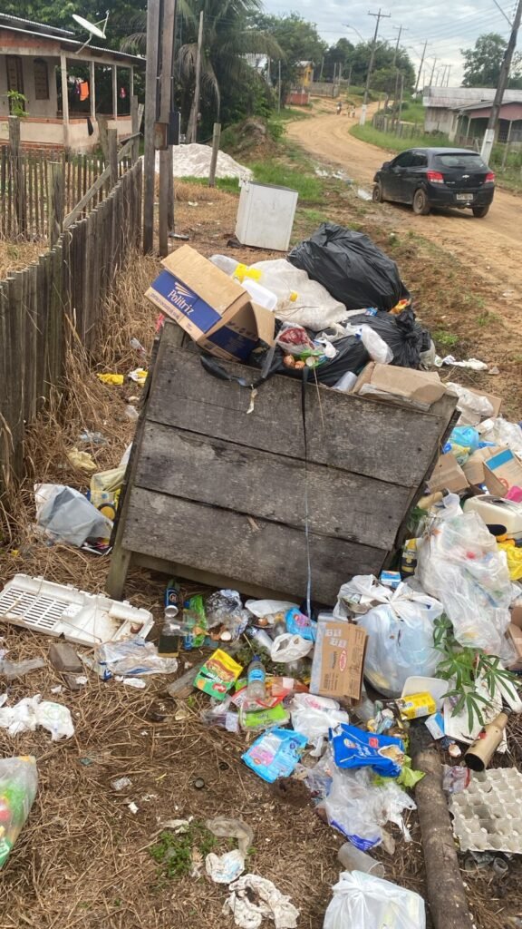 Segundo o denunciante, a comunidade está há muito tempo sem atendimento regular de coleta seletiva. Ele afirma que o lixo tem se acumulado em diversos pontos. “Tá feia a situação aqui”, relata.