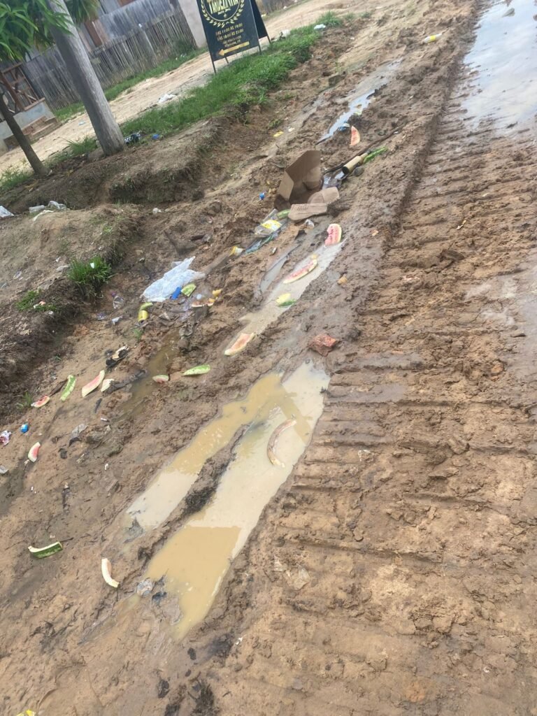 As imagens enviadas mostram ruas tomadas por lama em dias de chuva, além de resíduos sendo arrastados pela enxurrada. Em outros pontos da comunidade, o único acesso disponível é por estrada de barro, reforçando a precariedade da infraestrutura local.