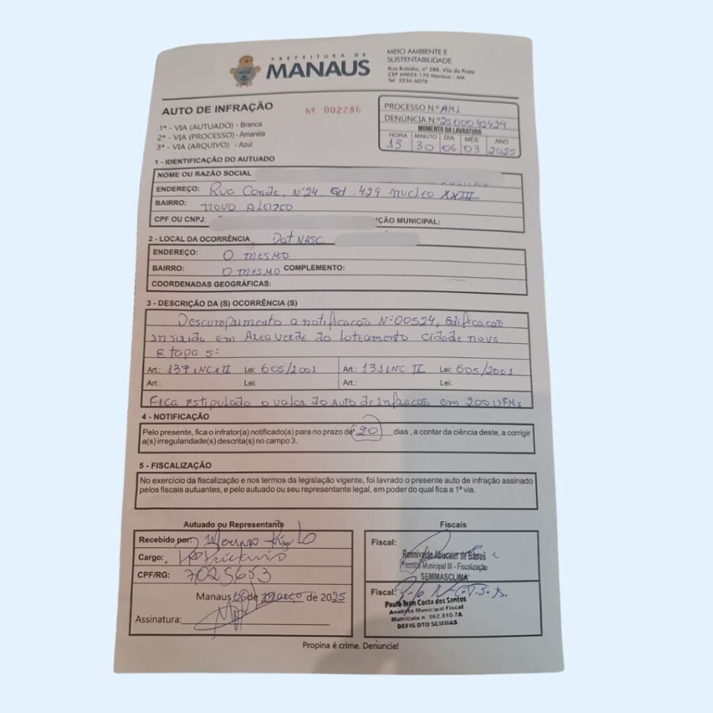 Após isso, o morador relata que a Secretaria de Meio Ambiente, acompanhada da Guarda Municipal de Manaus, fortemente armada, realizou uma visita a sua residência. O motivo foi uma vistoria na área, que resultou em uma multa de 200 Unidades Fiscais do Município (UFM) — ou seja, um valor superior a R$ 29 mil — sob a alegação de que o morador, que reside há 35 anos na região, teria construído sua casa em área verde.