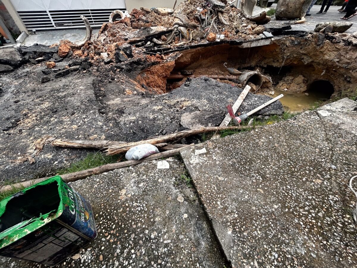 O buraco se abriu na noite de quarta-feira, 18/2, após as fortes chuvas, e evoluiu para uma grande cratera. Um veículo acabou sendo atingido, e a situação passou a representar risco para motoristas e pedestres que trafegam pela via.