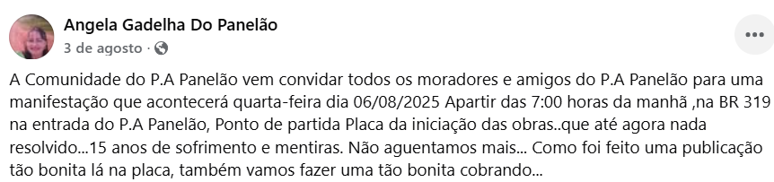O asfaltamento do ramal é cobrado há anos pelos moradores, mesmo com a obra estando prevista em convênio federal. Publicações feitas pela liderança comunitária mostram que, em agosto de 2025, a população já se mobilizava novamente para protestar, denunciando “15 anos de sofrimento e mentiras”.
