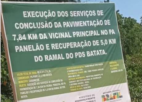 A placa instalada no local indica investimentos federais para a conclusão da pavimentação. Segundo o material, a obra contempla 7,84 quilômetros da vicinal principal do PA Panelão e a recuperação de 5 quilômetros do ramal do PDS Batata, totalizando R$ 4,5 milhões.