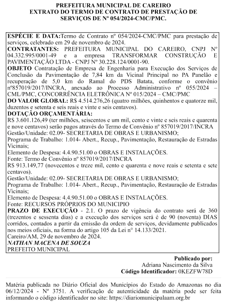 Contrato celebrado entre prefeitura e empresa responsável pelas obras de pavimentação – (Reprodução/DOM)