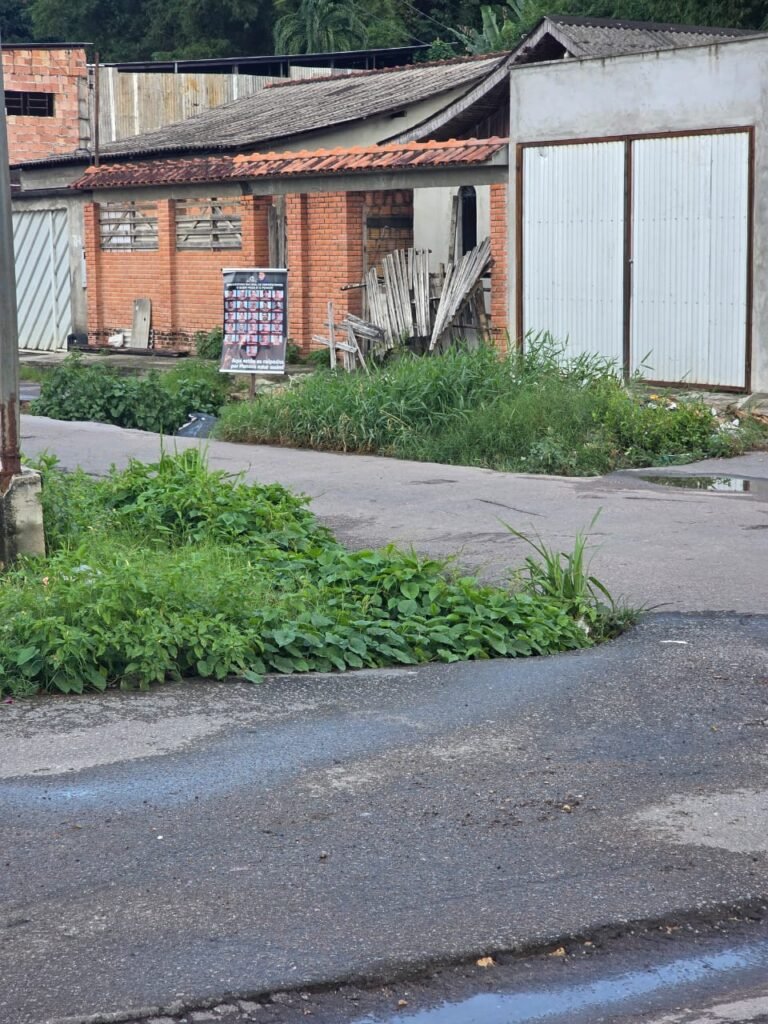 No local onde o banner foi colocado, é possível observar buracos, vegetação excessiva e falta de limpeza, evidenciando a necessidade urgente de melhorias na infraestrutura e nos serviços de limpeza pública.