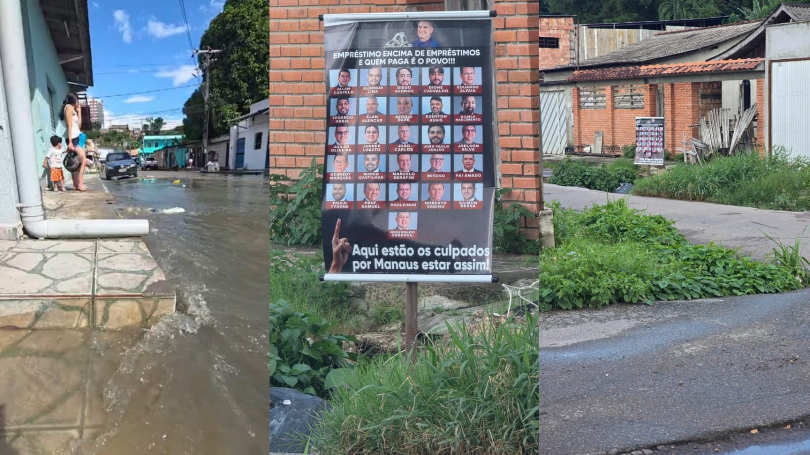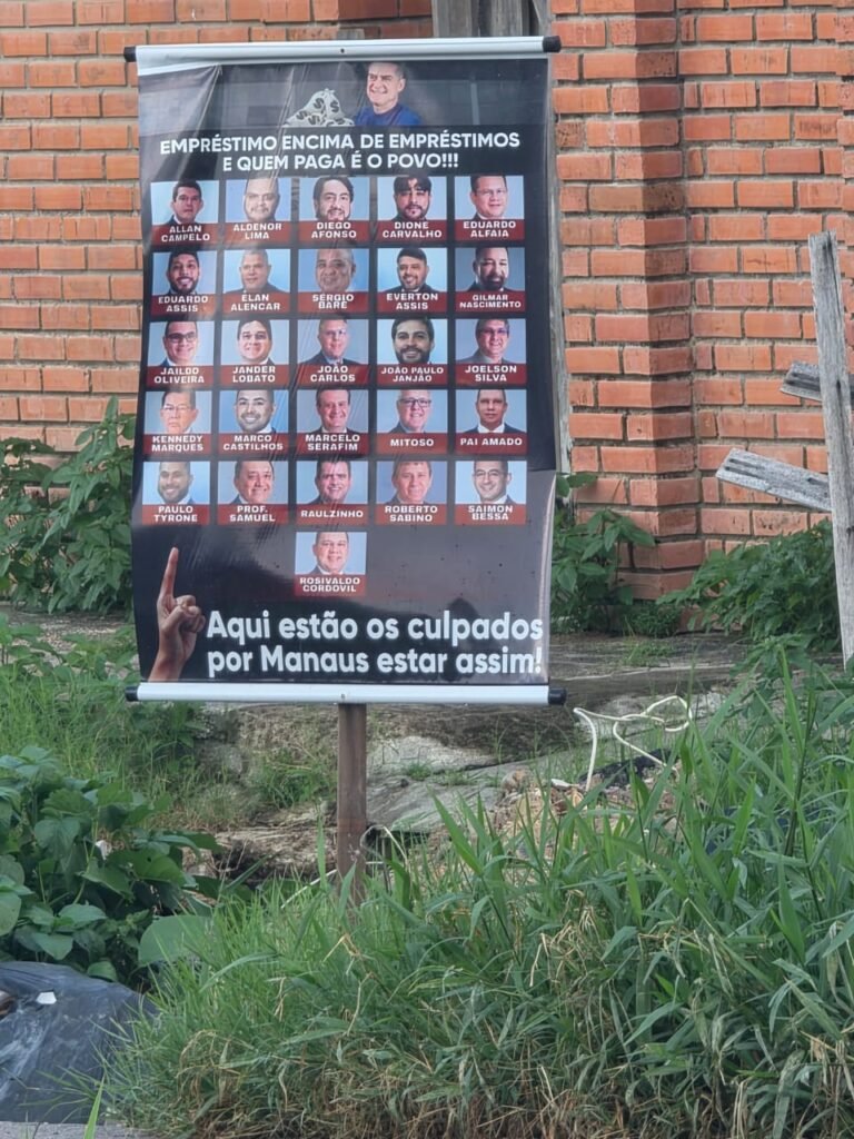 Cansados da situação, moradores instalaram um banner com imagens de vereadores da base do prefeito David Almeida (Avante) dentro de um buraco aberto na via, cobrando providências e questionando os gastos públicos. “Aqui estão os culpados por Manaus estar assim. Empréstimo em cima de empréstimos, e quem paga é o povo”, diz a mensagem.