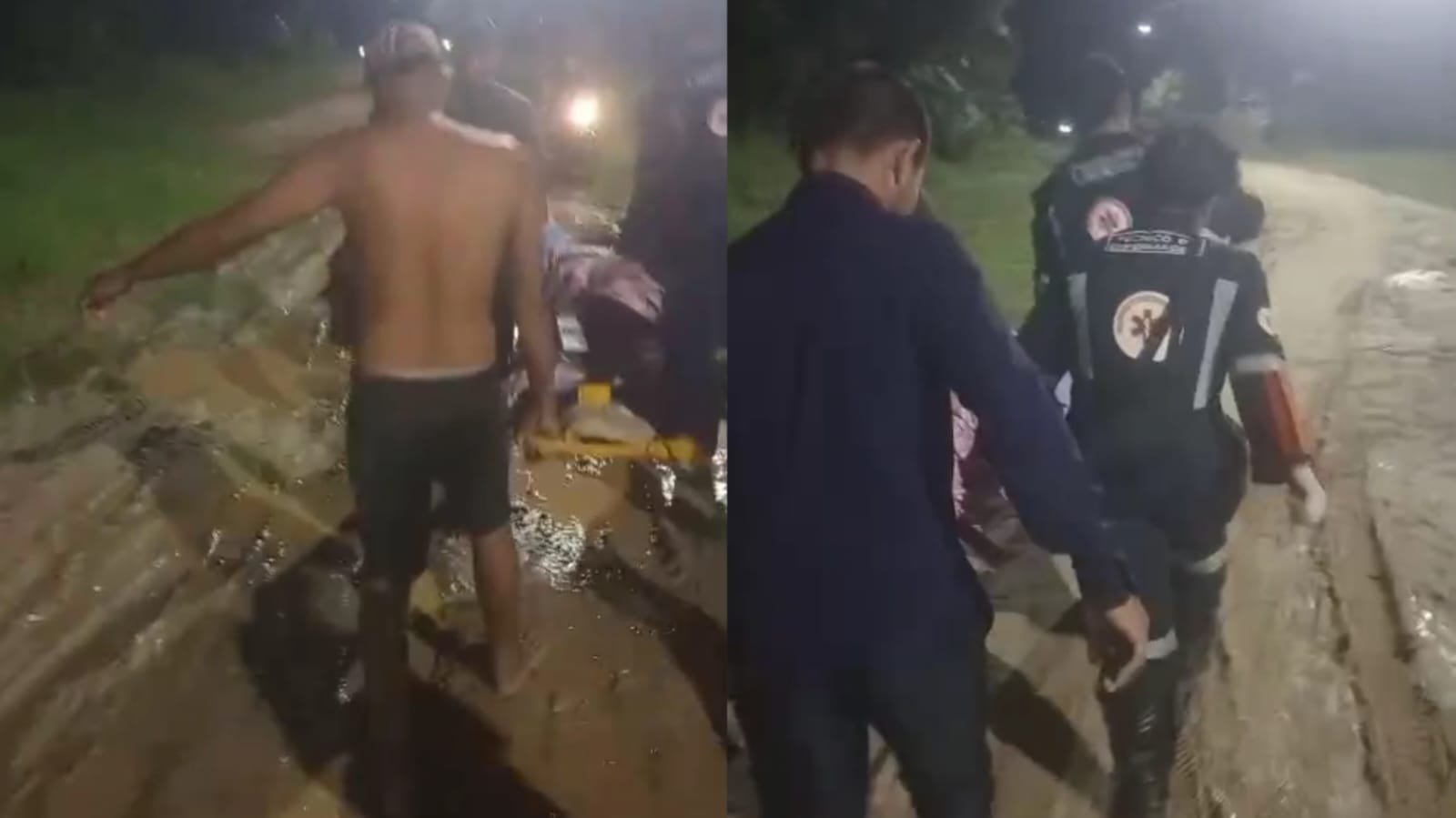 A ambulância, segundo os moradores, precisou estacionar distante do local, nas proximidades da Escola Coelho Peixoto, exigindo um longo percurso a pé em condições precárias. “Precisamos de ajuda. Aqui estão os nossos irmãos revezando para ajudar”, acrescenta o morador.