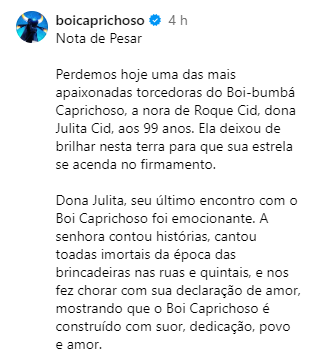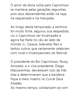 “A senhora contou histórias, cantou toadas imortais da época das brincadeiras nas ruas e quintais, e nos fez chorar com sua declaração de amor, mostrando que o Boi Caprichoso é construído com suor, dedicação, povo e amor. O amor de dona Julita pelo Caprichoso se manteve pelas gerações seguintes, pois seus descendentes estão na raça, na vaqueirada e na marujada”, diz um trecho da nota.