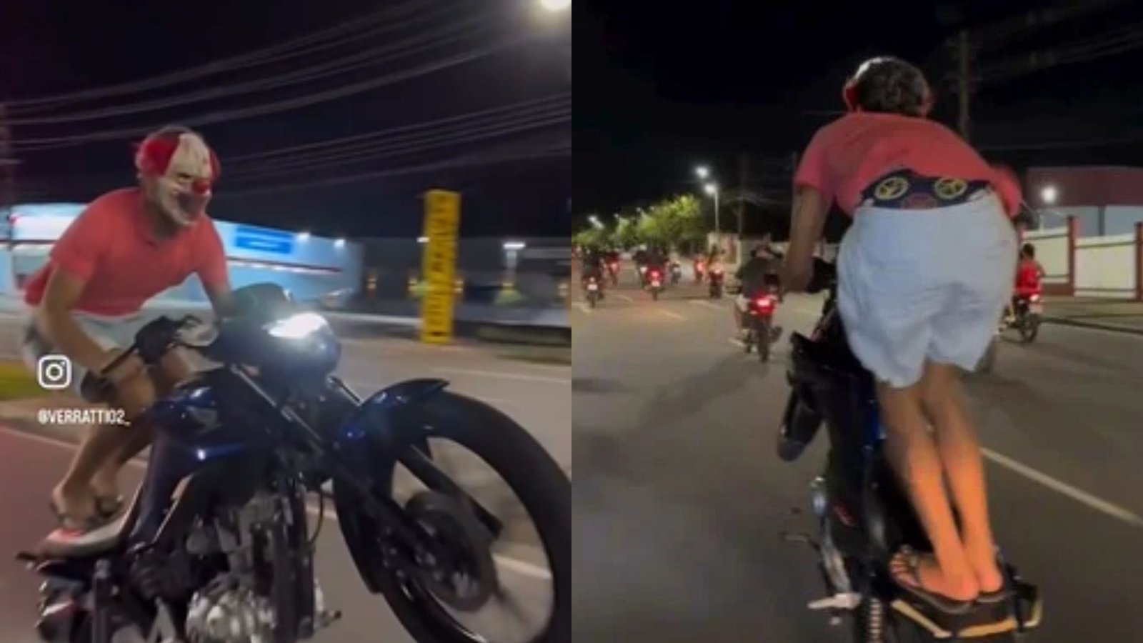 Nas imagens que circulam nas redes sociais, o jovem aparece empinando a motocicleta – prática conhecida como “grau” – enquanto utiliza uma máscara de palhaço e não usa capacete.