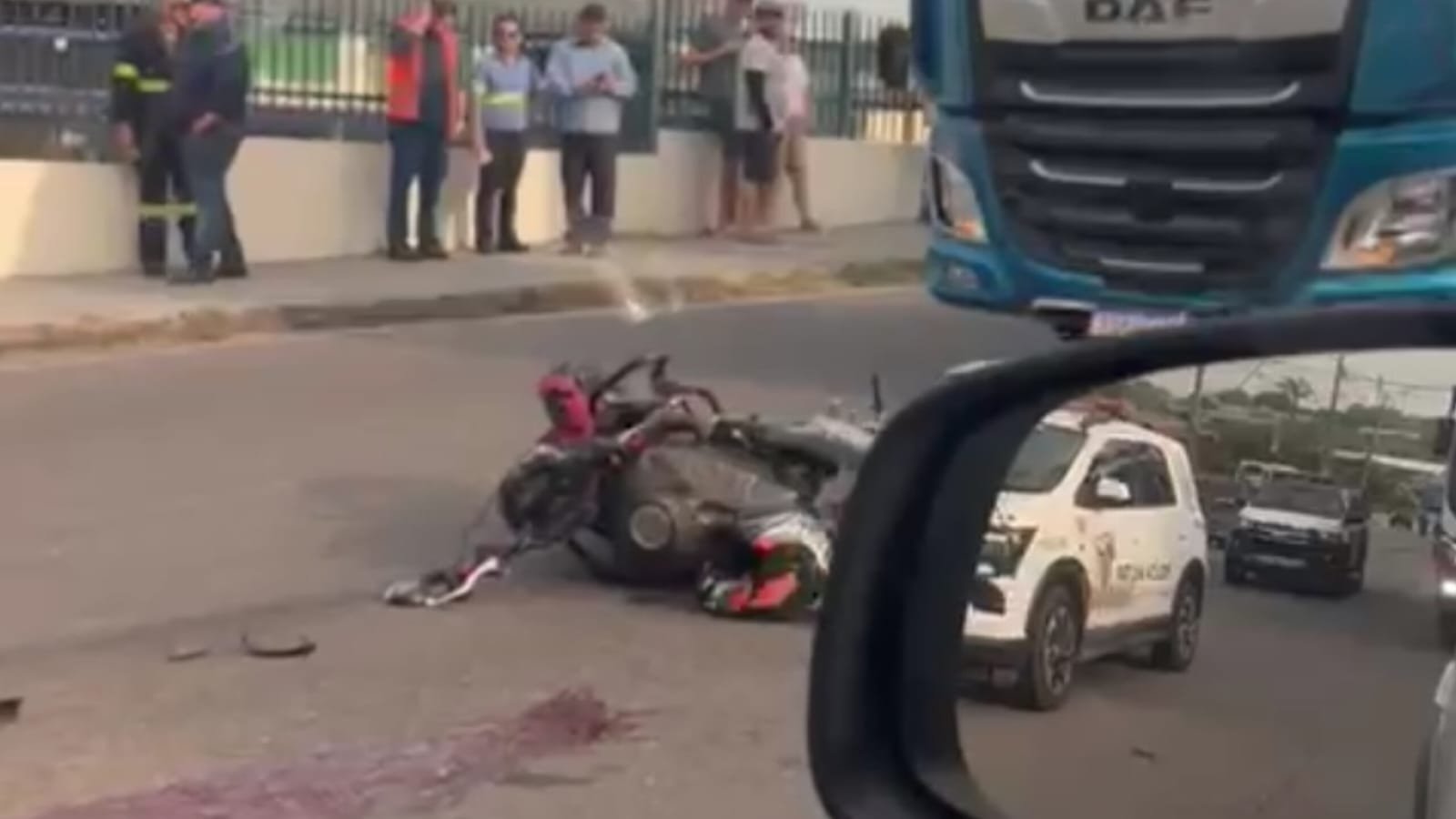 Com o impacto da batida, a estrutura da motocicleta foi completamente destruída. O capacete da vítima foi lançado ao chão, e a cena do acidente ficou marcada por vestígios de sangue e destroços.