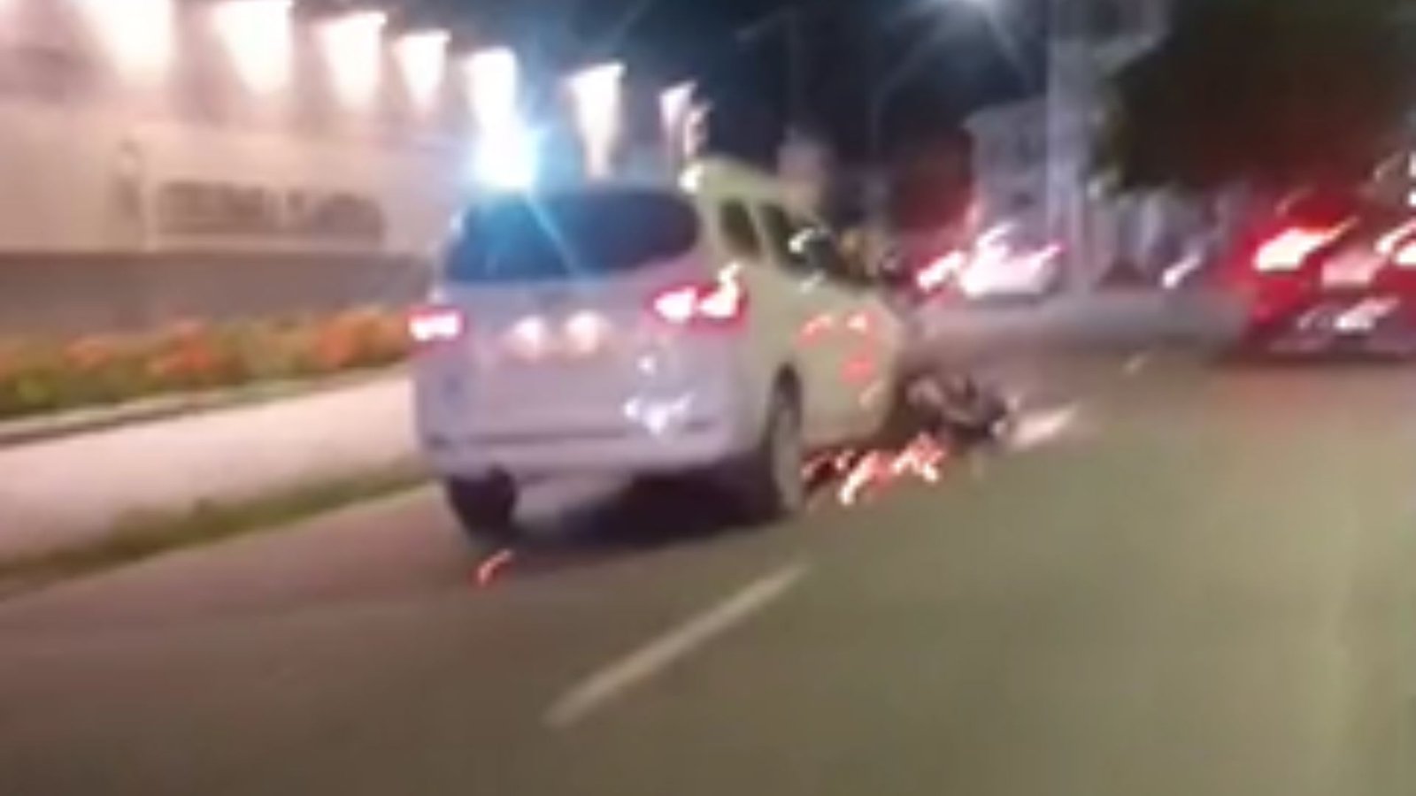 Vídeos gravados por motoristas que estavam no local mostram o momento em que a moto é arrastada, gerando faíscas na pista. Outros condutores buzinam, tentando alertar a motorista para que pare o carro, mas ela continua dirigindo com o veículo preso.