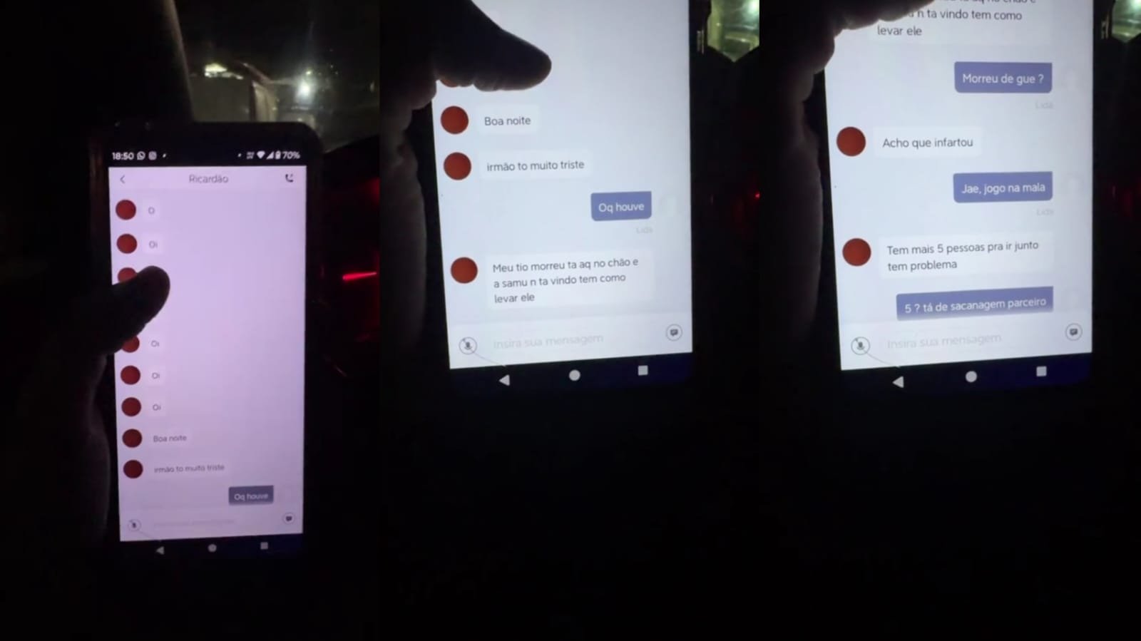 Em seguida, o homem explica que o tio havia infartado e que, inicialmente, o motorista, identificado como Erick Gustavo, aceitou a solicitação. Porém, o cliente então perguntou se seria possível levar mais cinco pessoas, além do corpo do tio.