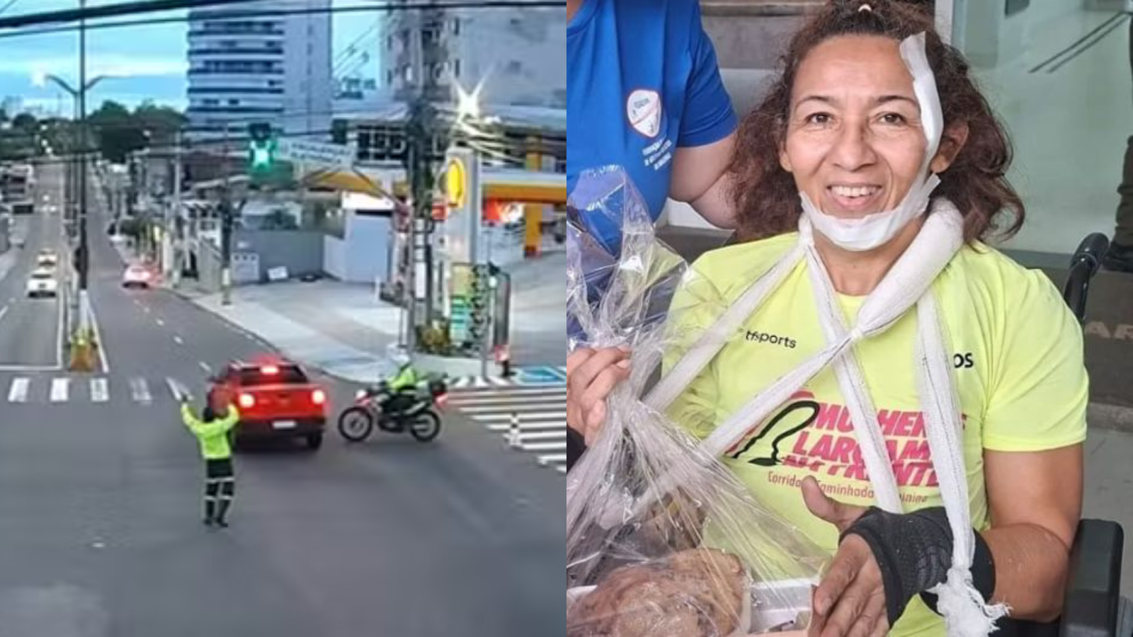 Imagens que circulam nas redes sociais mostram o momento em que um agente de trânsito, que estava no cruzamento das avenidas João Valério e Maceió, sinaliza para que um carro vermelho pare. O motorista, no entanto, desrespeita a ordem, avança o cruzamento e acaba atingindo a atleta.