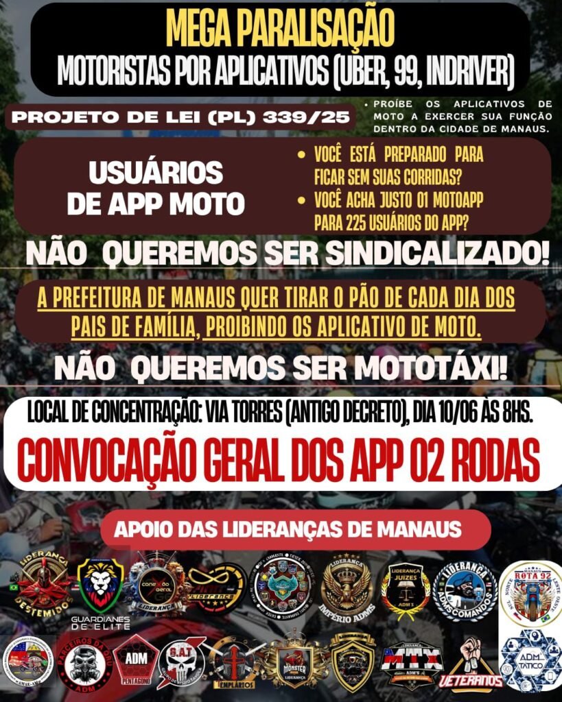 “Expressamos nossa indignação contra a Prefeitura e a Câmara Municipal de Manaus por adotarem uma medida arbitrária contra as plataformas digitais de transporte individual privado. Querem obrigar o cadastro de somente mototaxistas autorizados, penalizando as plataformas e, principalmente, os trabalhadores que prestam esse serviço”, diz a nota.