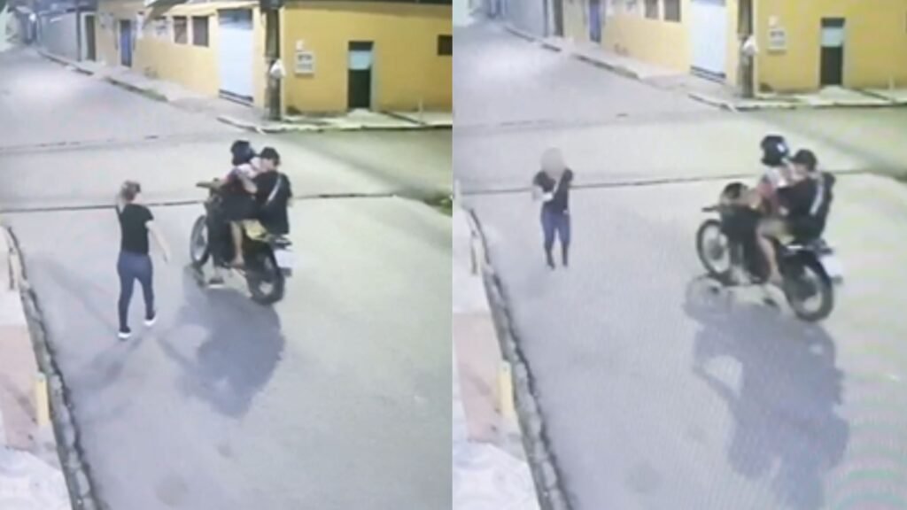As câmeras de segurança registraram o assalto. A vítima que estava indo para o trabalho por volta das 7h, foi abordada por dois homens em uma motocicleta de cor preta. Ao perceber que seria assaltada, tentou correr.