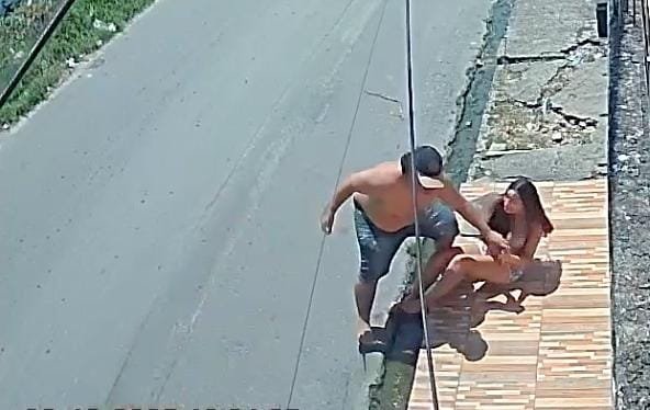 O suspeito, portando uma faca, ameaça a jovem, que se joga na calçada e entrega o celular para evitar ferimentos. Durante a ação, a outra mulher grita, desesperada: “Para, moço! Socorro! Deixa a minha filha, moço!”