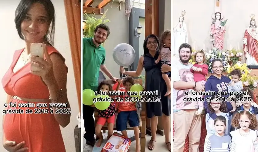 Mãe de seis filhos e esperando o sétimo, Leticia exibiu uma sequência de fotos que mostram sua trajetória de gestações, de 2014 a 2025, em uma montagem que comoveu seus seguidores.