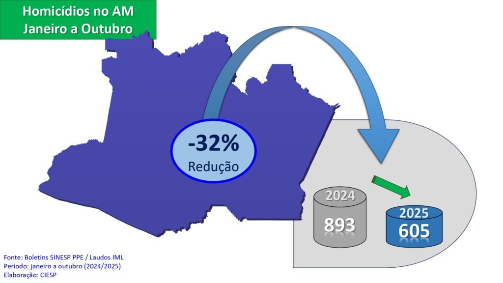 Segundo a Secretaria de Estado de Segurança Pública do Amazonas (SSP-AM), o número de homicídios caiu de 893 em 2024 para 605 em 2025, o que representa uma redução de 32%.
