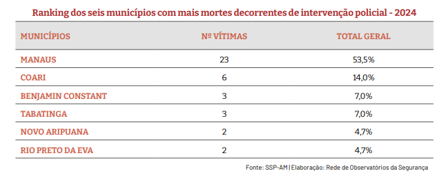 O estudo revela que essas mortes ocorreram em ações da Polícia Militar do Amazonas (PMAM) e da Polícia Civil do Amazonas (PCAM). O relatório destaca ainda que, segundo o Instituto Brasileiro de Geografia e Estatística (IBGE), o termo “negro” no Brasil abrange as pessoas pretas e pardas.