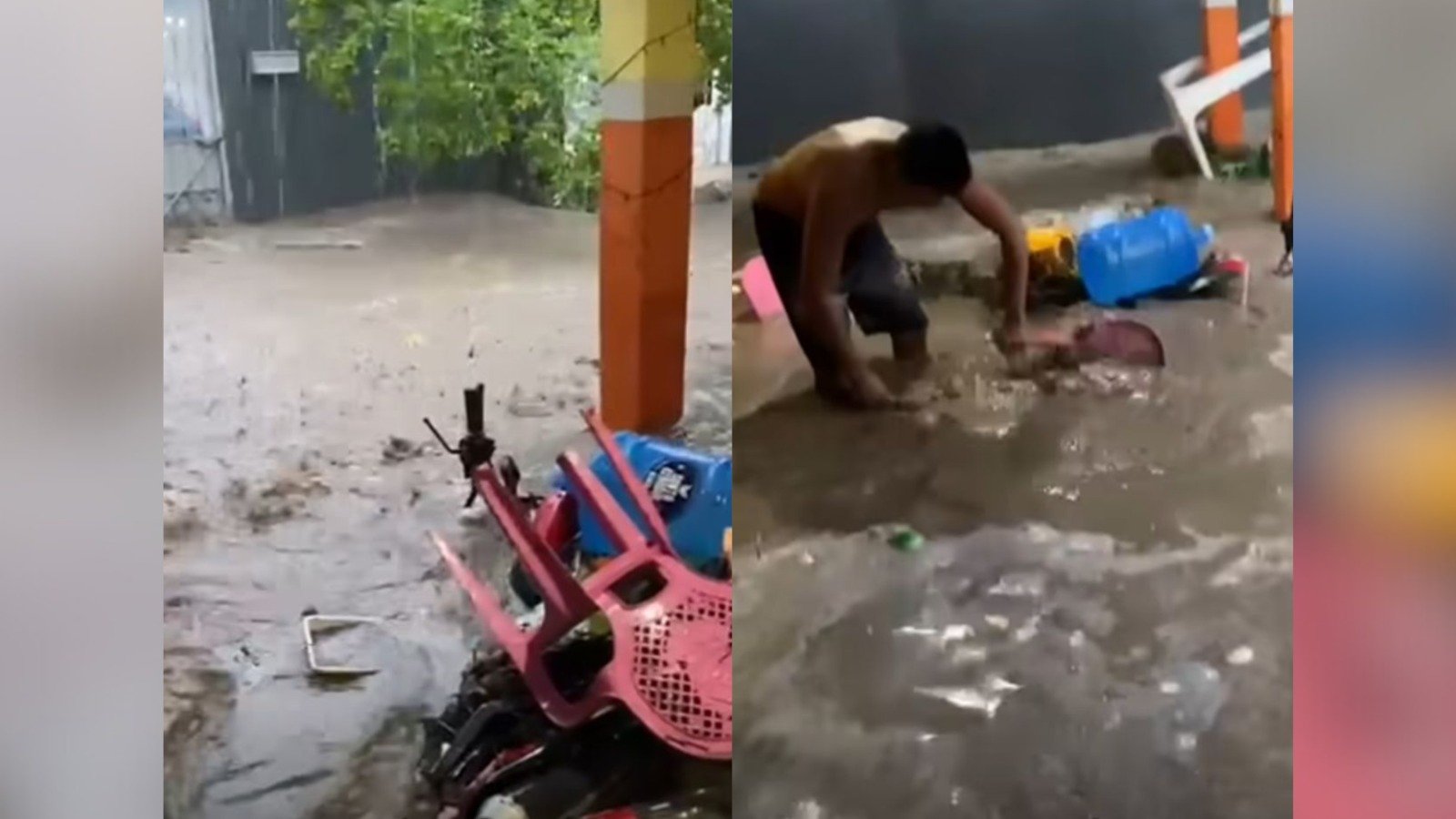 A gravação feita por Rafael mostra uma grande quantidade de água misturada com lama levando objetos da casa. A altura da água chega a encostar no joelho dos moradores.