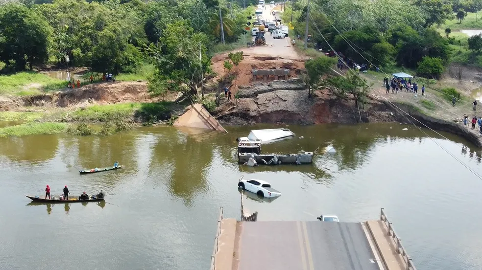 Em vídeo gravado no local, Plínio mostrou veículos enfrentando longas filas para atravessar o rio em balsas improvisadas, enquanto a estrutura de concreto permanece vazia.