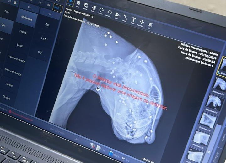 O felino ganhou repercussão nacional nesta quinta-feira, 2, após ser encontrado ferido por um tiro de espingarda na cabeça. As radiografias mostraram 36 projéteis de chumbo espalhados pela região do pescoço da onça.