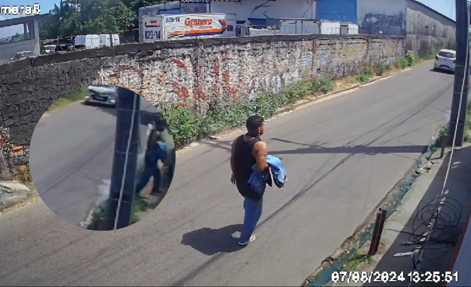 A ação foi registrada por câmeras de monitoramento da residência, que mostram o momento em que o suspeito passa caminhando em frente ao local sem levantar muitas suspeitas, se aproxima do muro e pula para dentro.