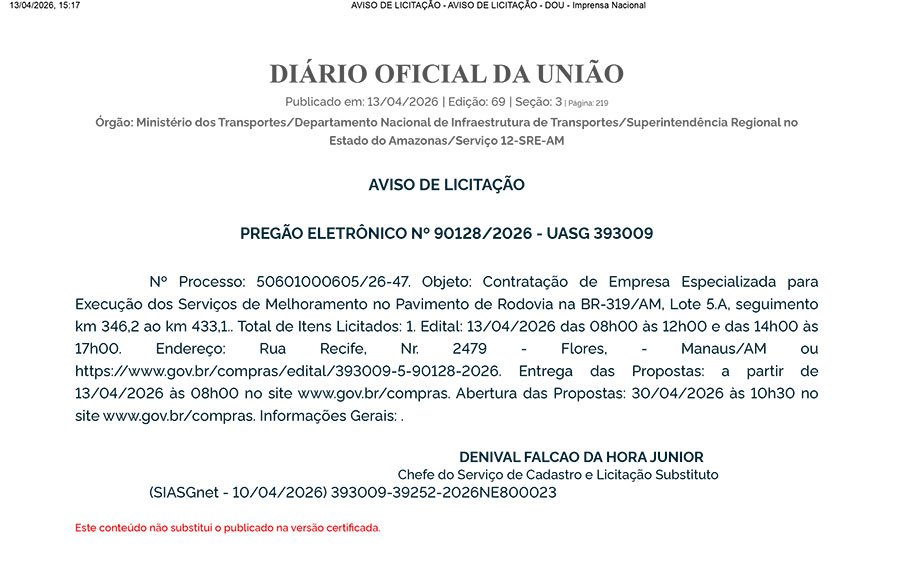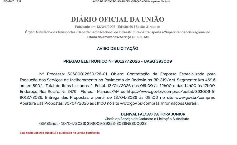• Prazos: Os pregões eletrônicos estão marcados para os dias 29 e 30 de abril. O DNIT justifica a pressa citando a estiagem como uma “janela de oportunidade” para o início dos trabalhos.