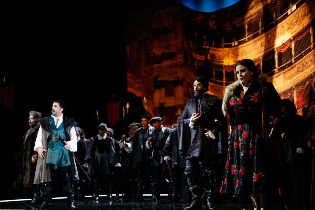 No palco, o Coral do Amazonas e solistas sustentam quatro horas de ópera em um cenário exuberante com projeções realistas. A soprano, Tatiana Carlos, que interpreta Anna Bolena, arrancou aplausos da plateia, logo no primeiro ato.