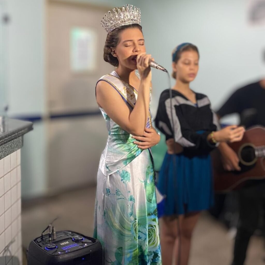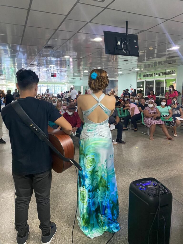 MANAUS (AM) – Cumprindo agenda de compromissos no Amazonas, a Miss Rondônia Khrystma Siberth esteve na Fundação Cecon (FCecon) , no bairro Planalto, zona Centro-Oeste, em ação promovida pela Castello Connection na manhã desta quinta-feira, 13/7, em Manaus. A modelo participou de uma programação musical com voz e violão no ambulatório acompanhada do músico Vinicius Reels.