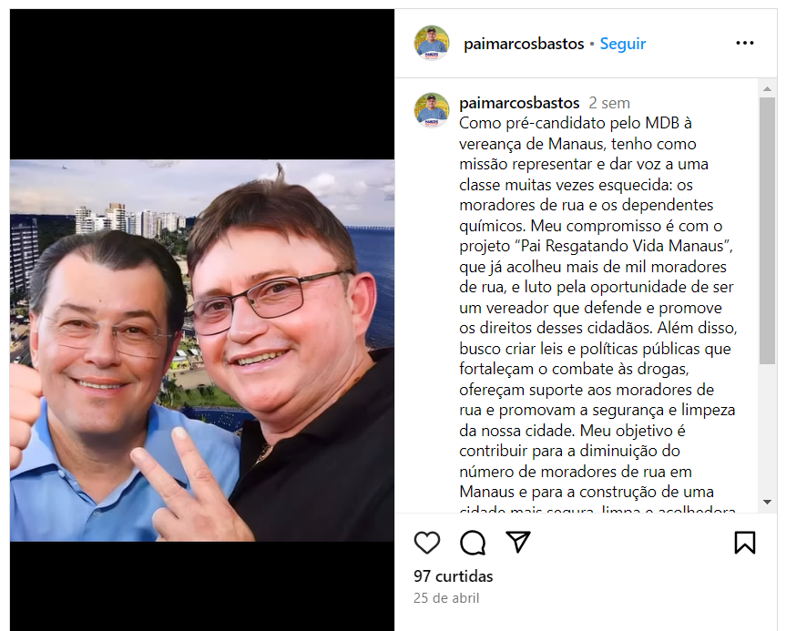 Nas redes sociais, imagens mostram uma relação próxima entre Marcos Bastos e o senador Eduardo Braga, como em uma publicação de 25 de abril, onde o líder da ONG aparece ao lado do senador e anuncia sua pré-candidatura para vereador com o apoio do parlamentar. “Agradeço imensamente o apoio do senador Eduardo Braga, que tem sido fundamental para essa jornada e a todos que estão ao meu lado nessa luta”, disse na postagem.