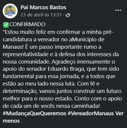 MANAUS (AM) – O chefe da ONG ‘Pai Resgatando Vidas’, Cid Marcos Bastos Reis Maia, conhecido como ‘Pai Marcos Bastos’, anunciou a sua pré-candidatura para a Câmara Municipal de Manaus pelo partido Movimento Democrático Brasileiro (MDB) com apoio do senador Eduardo Braga duas semanas antes de ser preso pela Polícia Civil do Amazonas.