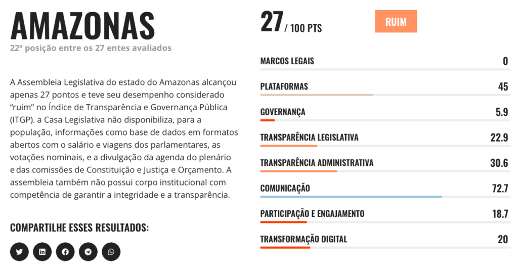 Na classificação geral, o Amazonas ficou com a  22ª  posição dentre as Casas Legislativas dos 27 entes federativos brasileiros. Um dos principais problemas apontados pelo estudo é a falta de disponibilização de informações importantes para a população. A casa Legislativa amazonense não fornece dados como salários e viagens dos parlamentares, votações nominais, além da divulgação da agenda do plenário e das comissões de Constituição e Justiça e Orçamento, em formatos abertos.