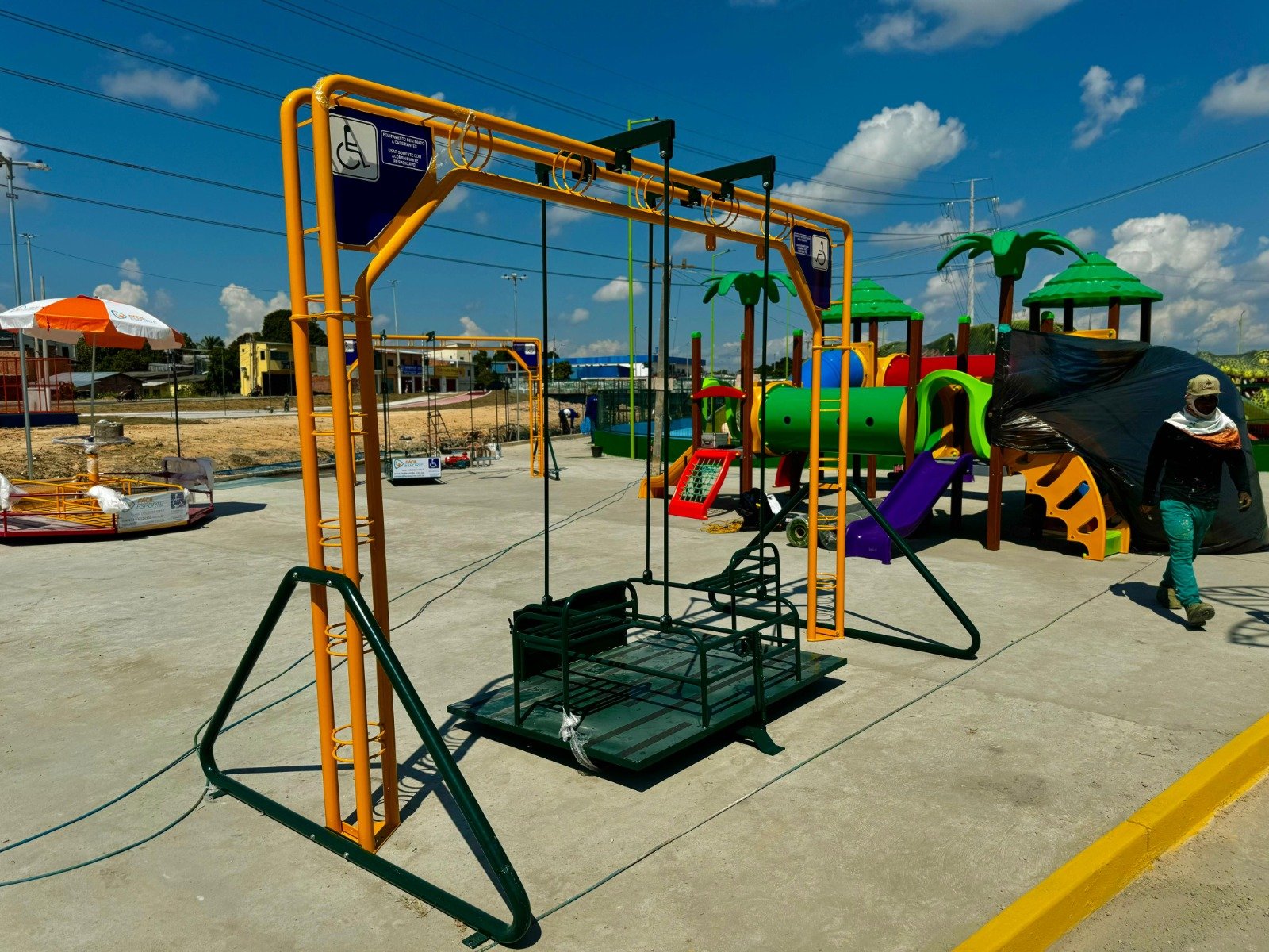 Os brinquedos são balanços e gangorras para atender, exclusivamente, Pessoas com Deficiência (PcDs) e cadeirantes, com alto padrão de acabamento e de qualidade, e totalmente adaptados, instalados em piso de grama sintética. O material foi adquirido de uma empresa especializada nesse tipo de equipamento. O projeto arquitetônico e urbanístico do complexo é do Instituto Municipal de Planejamento Urbano (Implurb).