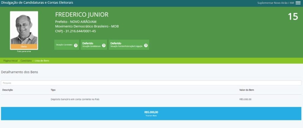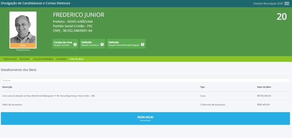 MANAUS (AM) – O patrimônio do prefeito Frederico Júnior (União Brasil), de Novo Airão (a 194 quilômetros de Manaus), teve um aumento exponencial, passando de R$ 5.000, em 2018, para mais de R$ 200 mil em bens declarados em 2020.