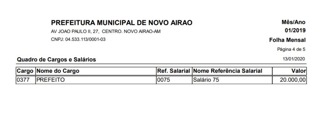 O salário para o cargo de prefeito em Novo Airão é de R$ 20.000,00 bruto. Após os descontos, o rendimento líquido é de cerca de R$ 14.500,00 por mês.