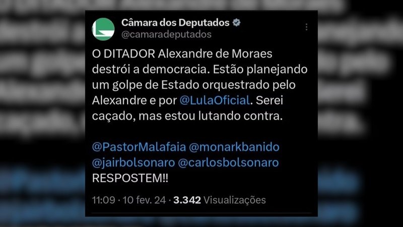 A mensagem foi excluída poucos minutos após a publicação. A Casa apura o que houve, e a assessoria de imprensa da Presidência informou que a senha da conta já foi trocada. A Câmara divulgará nota sobre o ocorrido ainda neste sábado, 10/2.