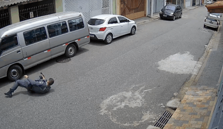 No vídeo, é possível ver o momento em que o suspeito tenta se esconder atrás de um carro e aponta uma arma contra o policial, que reage disparando aproximadamente 15 vezes. O homem caiu logo em seguida.