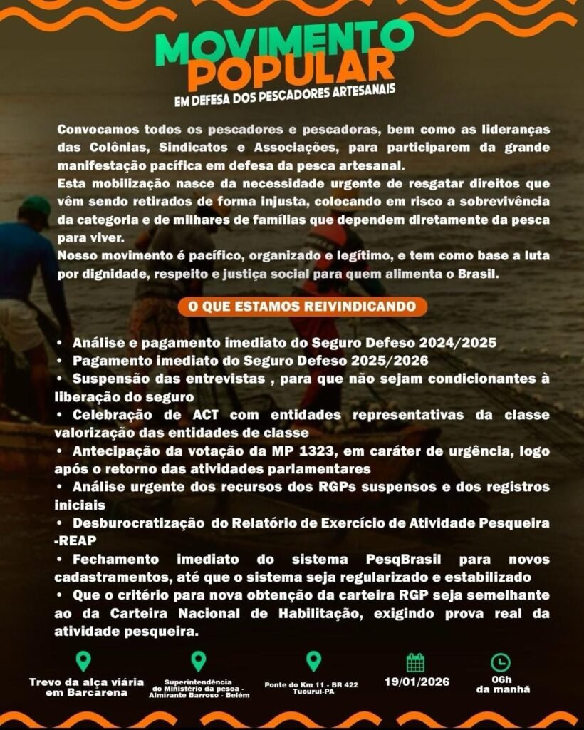 Na região Norte, a manifestação ocorrerá no Trevo da Alça Viária, em Barcarena (PA), na Superintendência do Ministério da Pesca – Almirante Barroso, no dia 19 de janeiro, a partir das 6h.