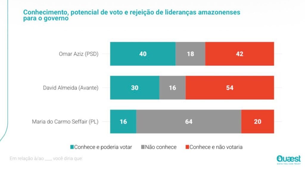 O levantamento também revela altos índices de rejeição para outros nomes da política estadual. O senador e pré-candidato ao governo, Omar Aziz (PSD), aparece com 42% de rejeição, dividindo espaço na disputa com David Almeida, que soma 54% de rejeição.