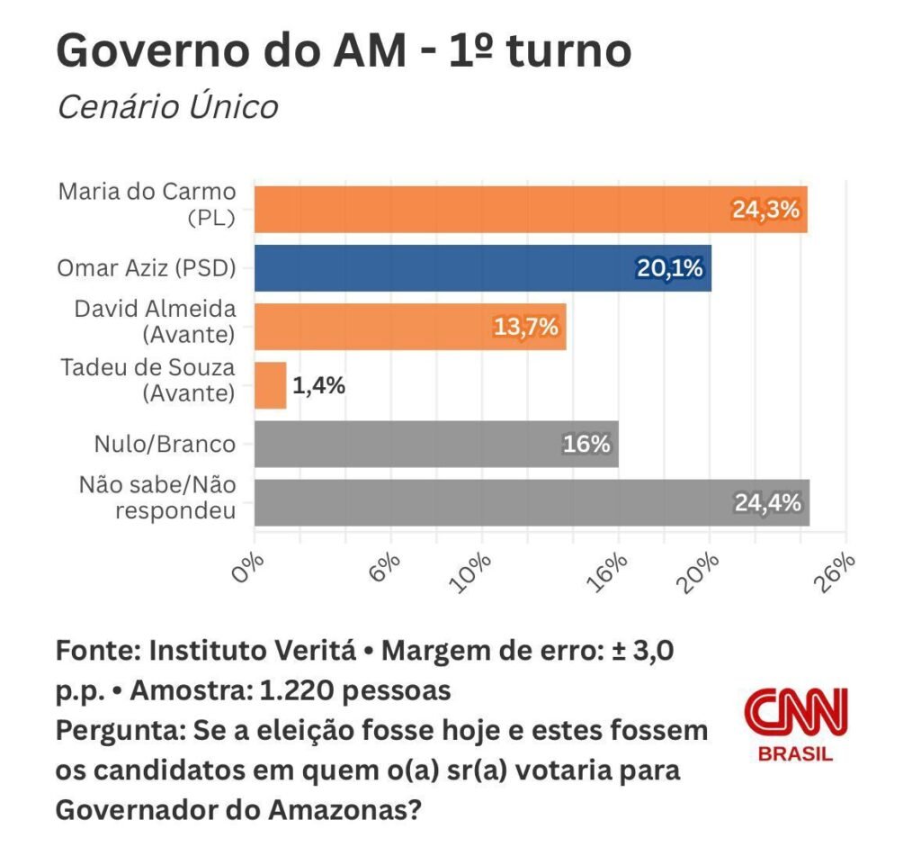 Divulgado nesta sexta-feira, 27/3, pela CNN Brasil, o levantamento aponta Maria do Carmo com 24,3% das intenções de voto, contra 20,1% de Omar Aziz, mostrando um empate técnico dentro da margem de erro.