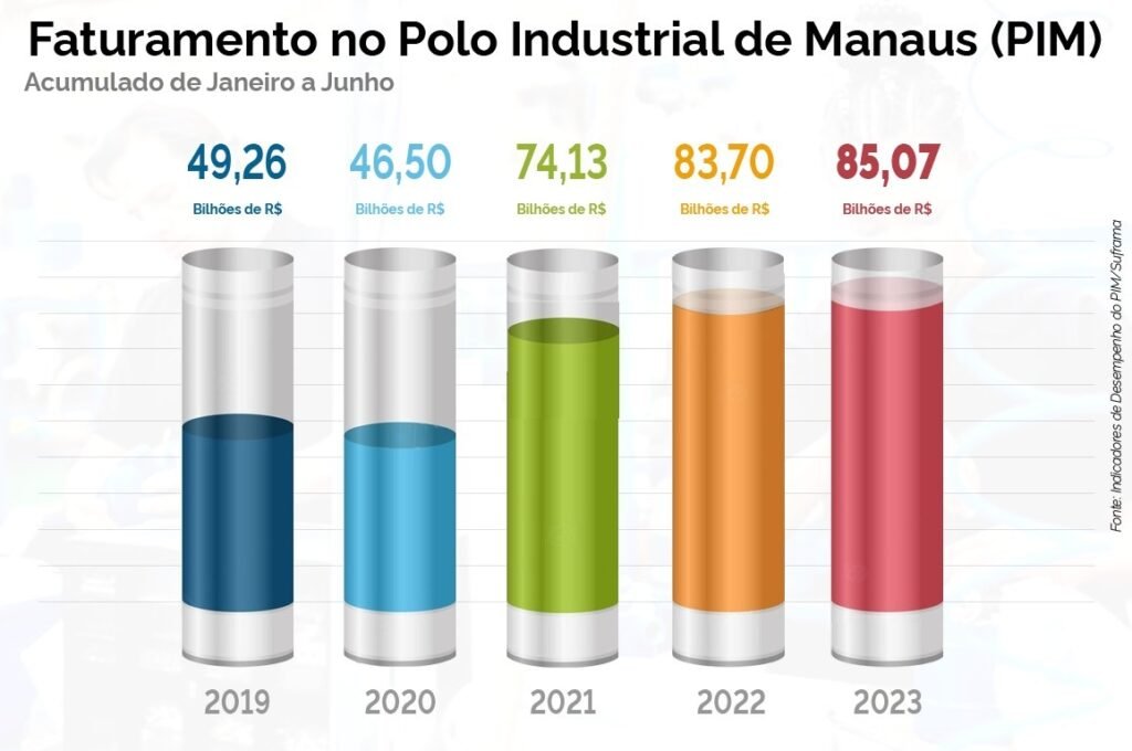 MANAUS (AM) – Nos primeiros seis meses de 2023, o Polo Industrial de Manaus (PIM), constituído por aproximadamente 500 empresas, alcançou um faturamento de R$ 85,07 bilhões, registrando um aumento de 1,64% em relação ao mesmo período de 2022. Em dólar, moeda norte-americana, o faturamento totalizou US$ 16,83 bilhões, denotando um acréscimo de 0,22%.