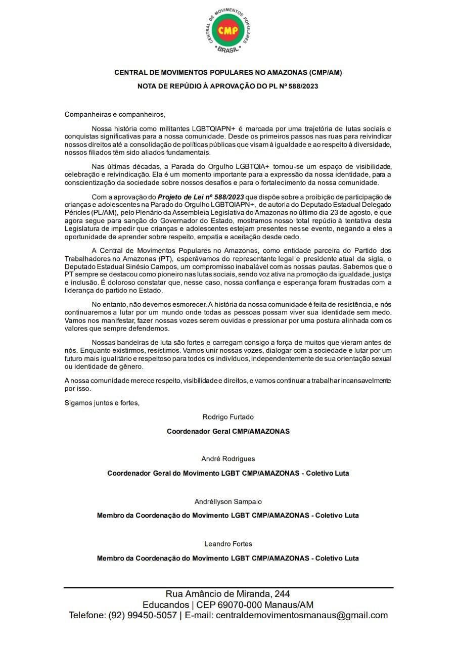 “A CMP/AM entende que combater as diversas práticas de homofobia, se dá por meio das intervenções populares necessárias no seio da arena política brasileira, exemplo claro em que o Poder Legislativo Estadual (ALEAM) tenta criminalizar e imoralizar a Parada do Orgulho LGBTQIAP+ no Estado, imputando ao evento estereótipos deletérios que corrompe a sociedade e destila ódio ao invés do amor”, trecho da nota divulgada pelo CMP/AM.
