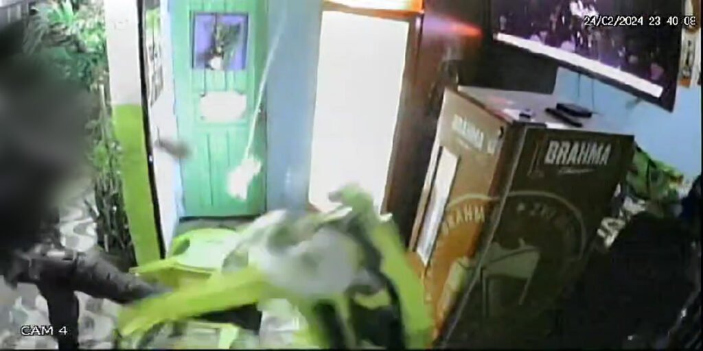 Nas imagens de câmeras de segurança que flagraram a ação, os moradores estão sentados em frente à distribuidora quando o policial chega abordando as pessoas apontando o fuzil e atingindo homens e uma mulher com chutes. O militar ainda quebrou o velocípede de uma criança, mesa e cadeira.